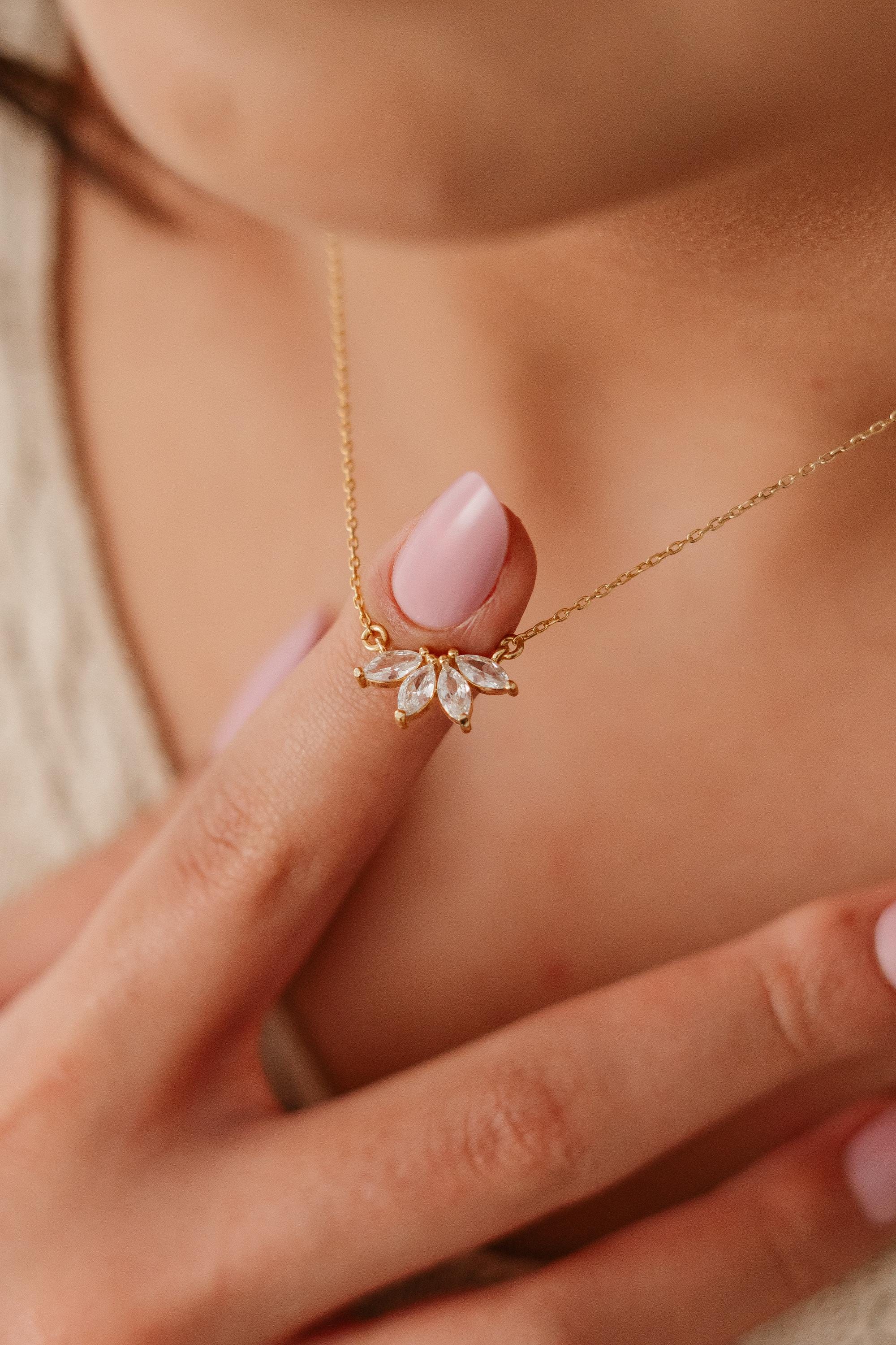 hine with timeless elegance wearing our Marquise Crystal Leaf Necklace, a delicate piece of handcrafted jewelry made from 100% sterling silver and plated in your choice of 14K gold, silver, or rose gold.
