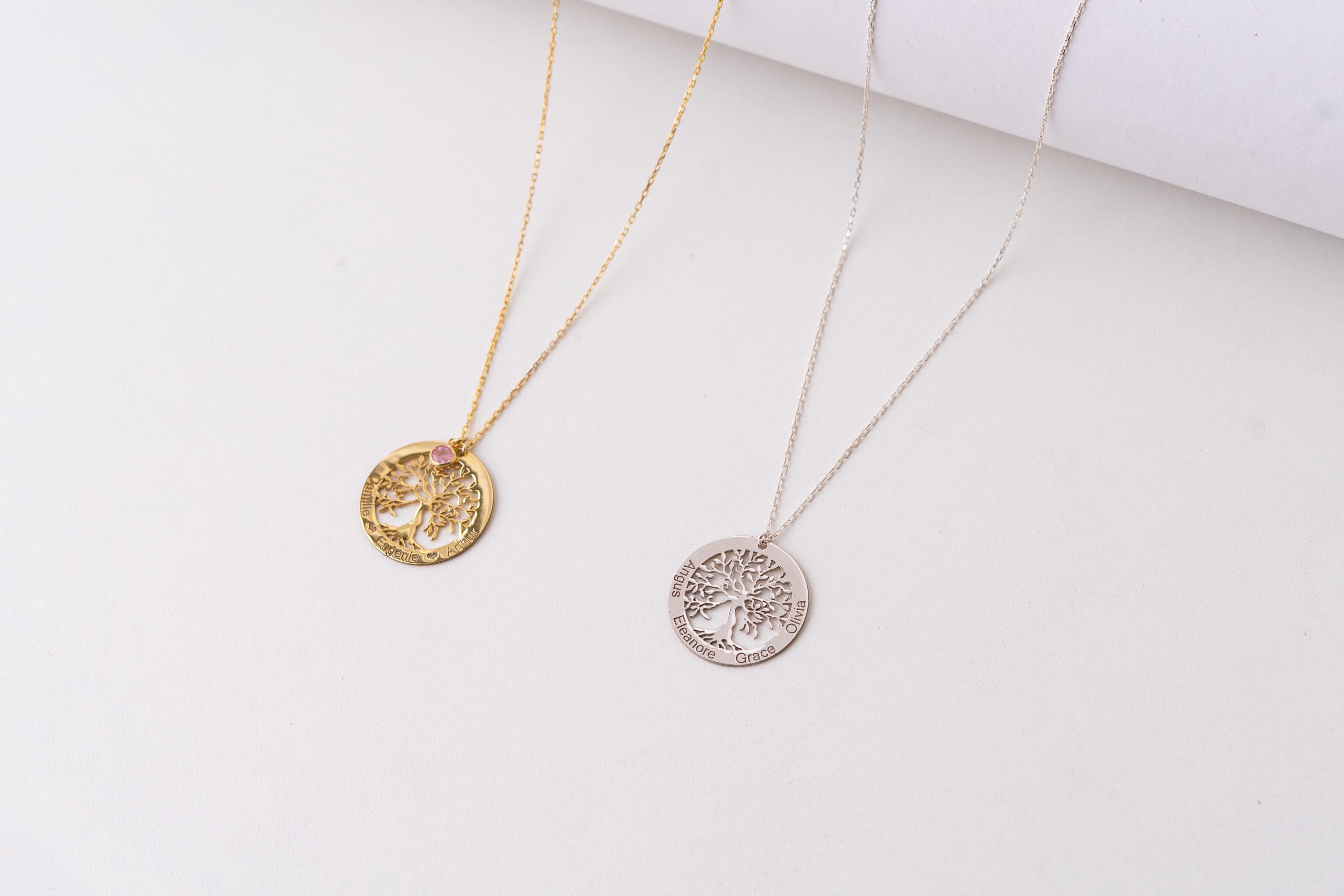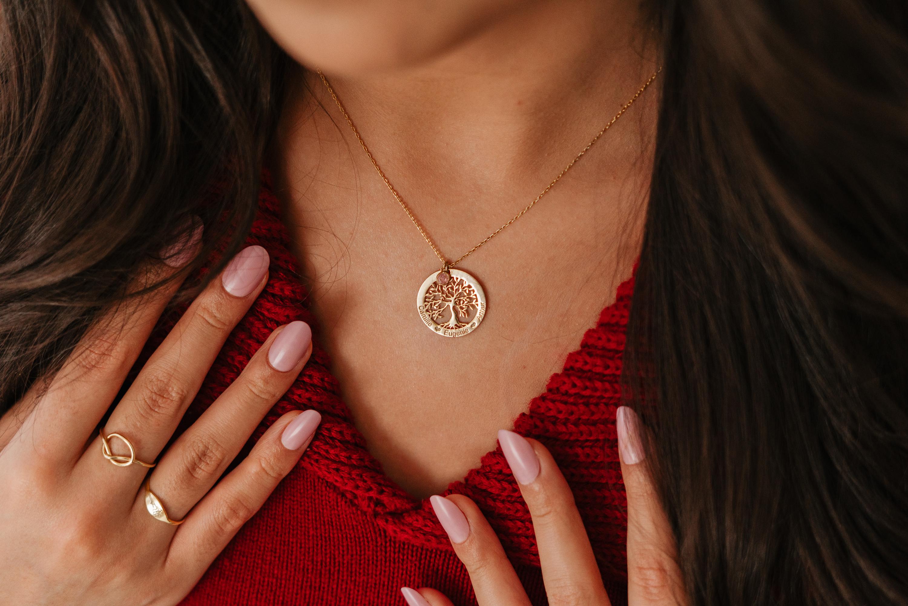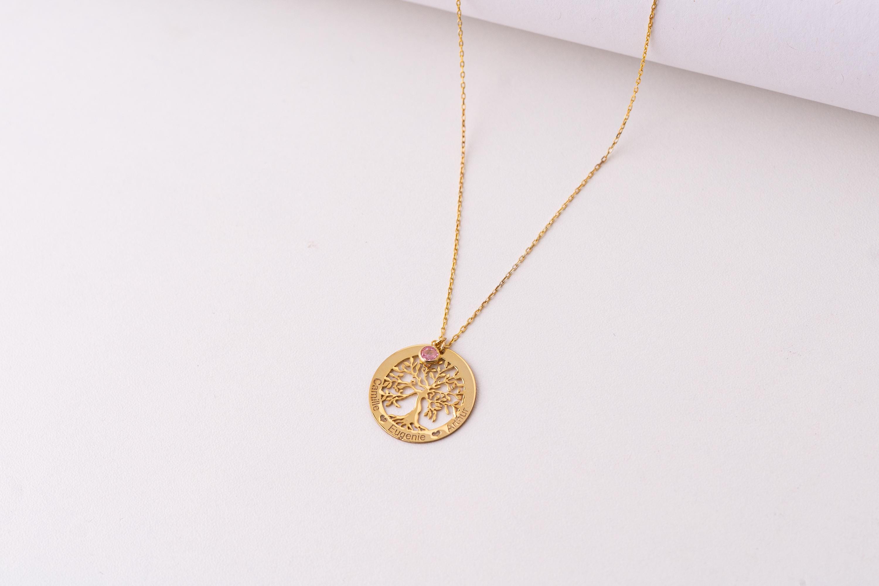 Celebrate family and connection with our family tree necklace, a meaningful gold tree of life pendant personalized with engraved names. Each necklace is carefully crafted to symbolize love, unity, and generations, making it a thoughtful piece of family name jewelry.