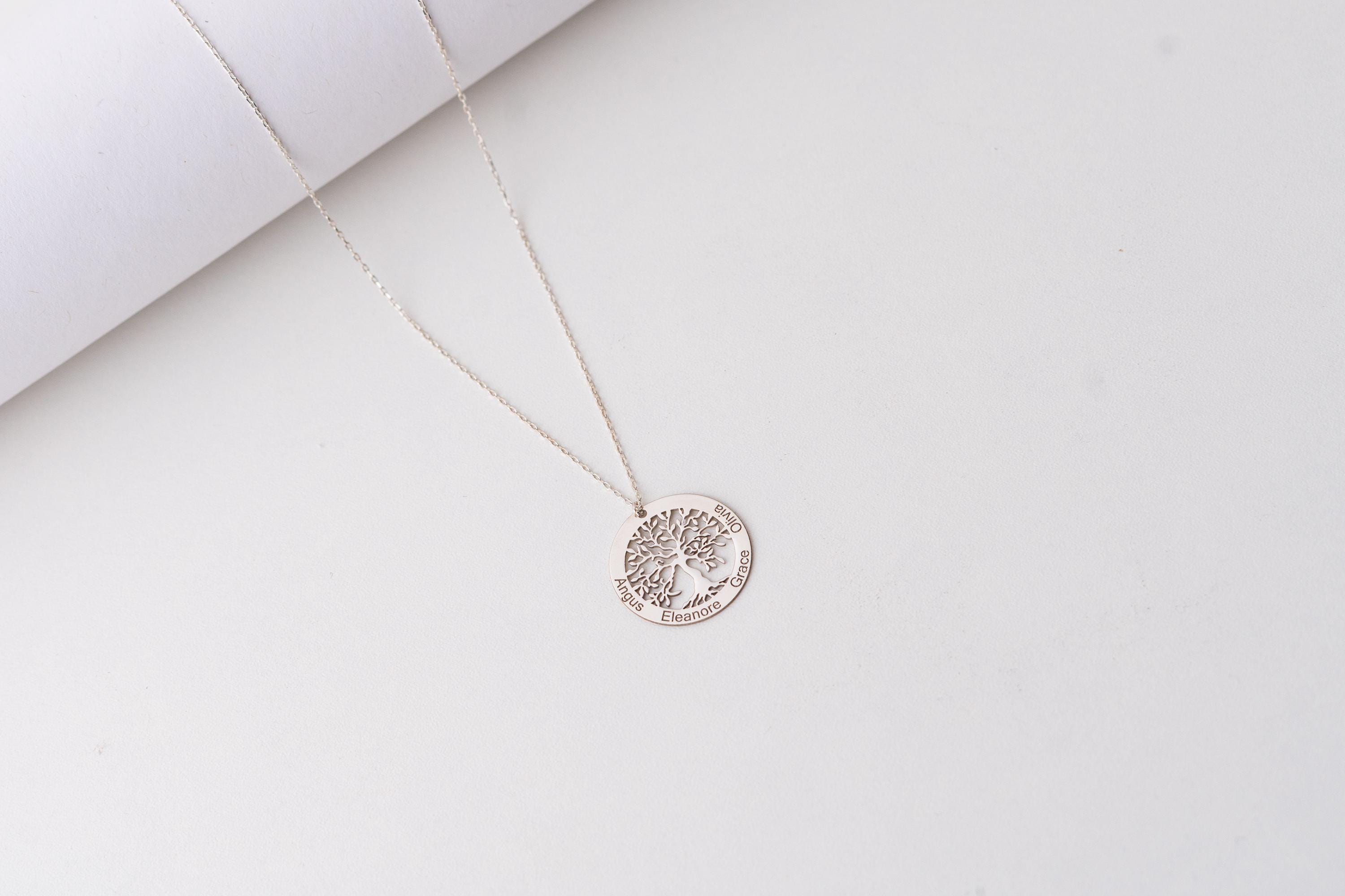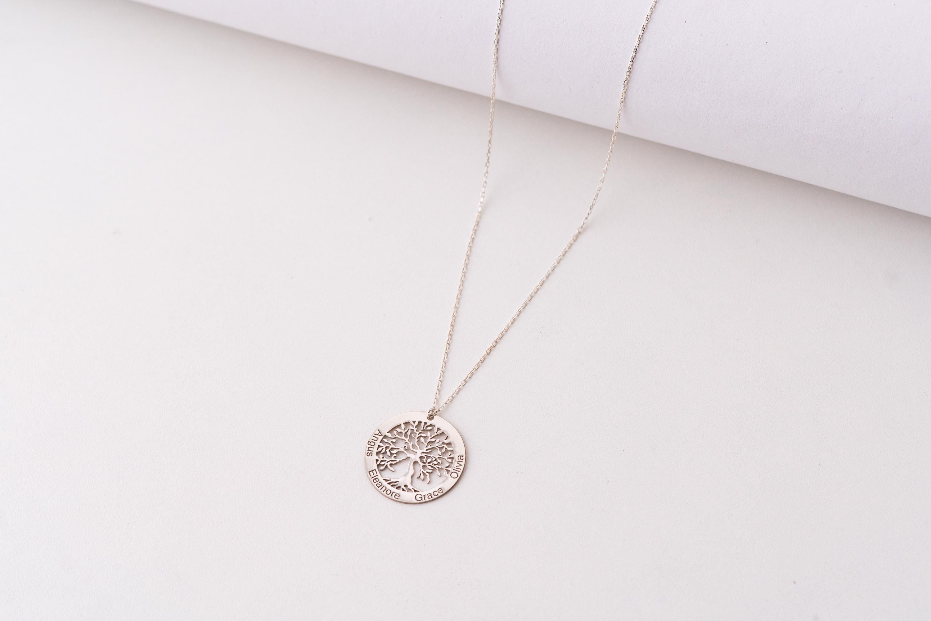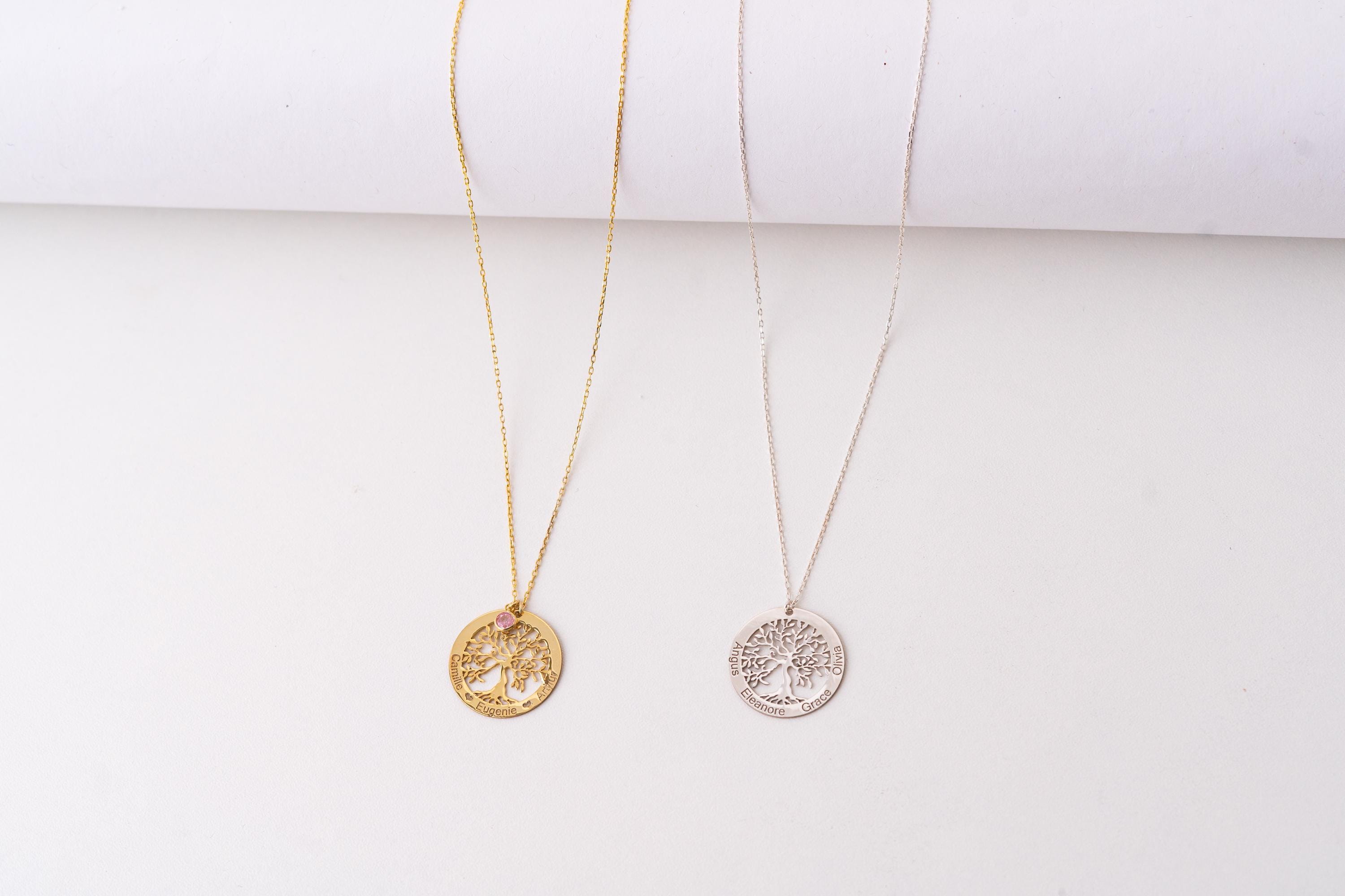 Celebrate family and connection with our family tree necklace, a meaningful gold tree of life pendant personalized with engraved names. Each necklace is carefully crafted to symbolize love, unity, and generations, making it a thoughtful piece of family name jewelry.