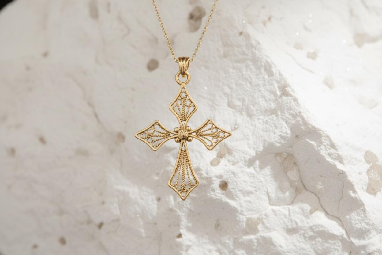Shine with timeless faith and elegance wearing our Filigree Cross Necklace, handcrafted in gold, silver, or rose gold finishes. This dainty cross necklace features a delicate antique filigree cross design, symbolizing love, protection, and spirituality — perfect as a baptism gift, Christian jewelry, or Christmas gift for her.