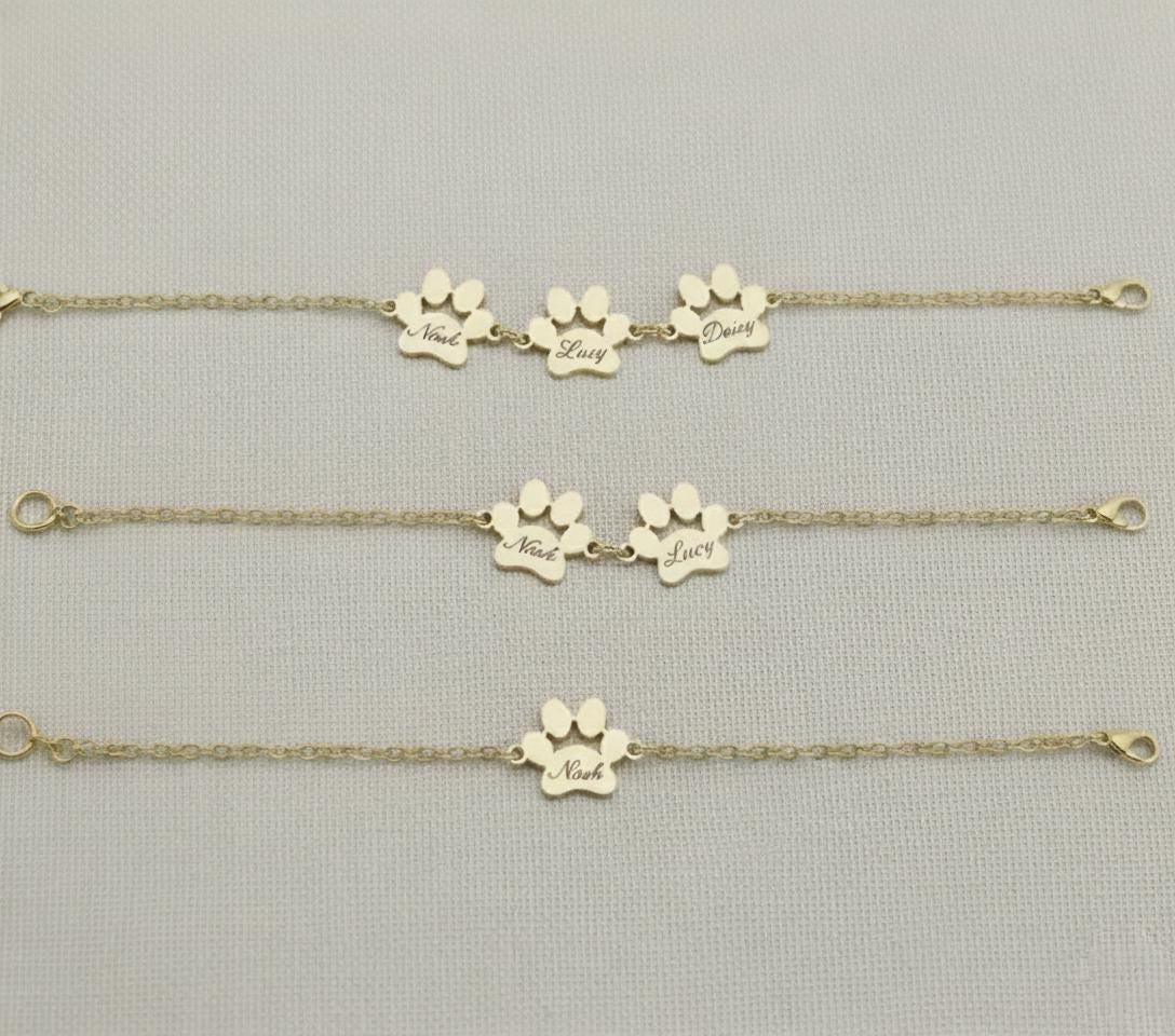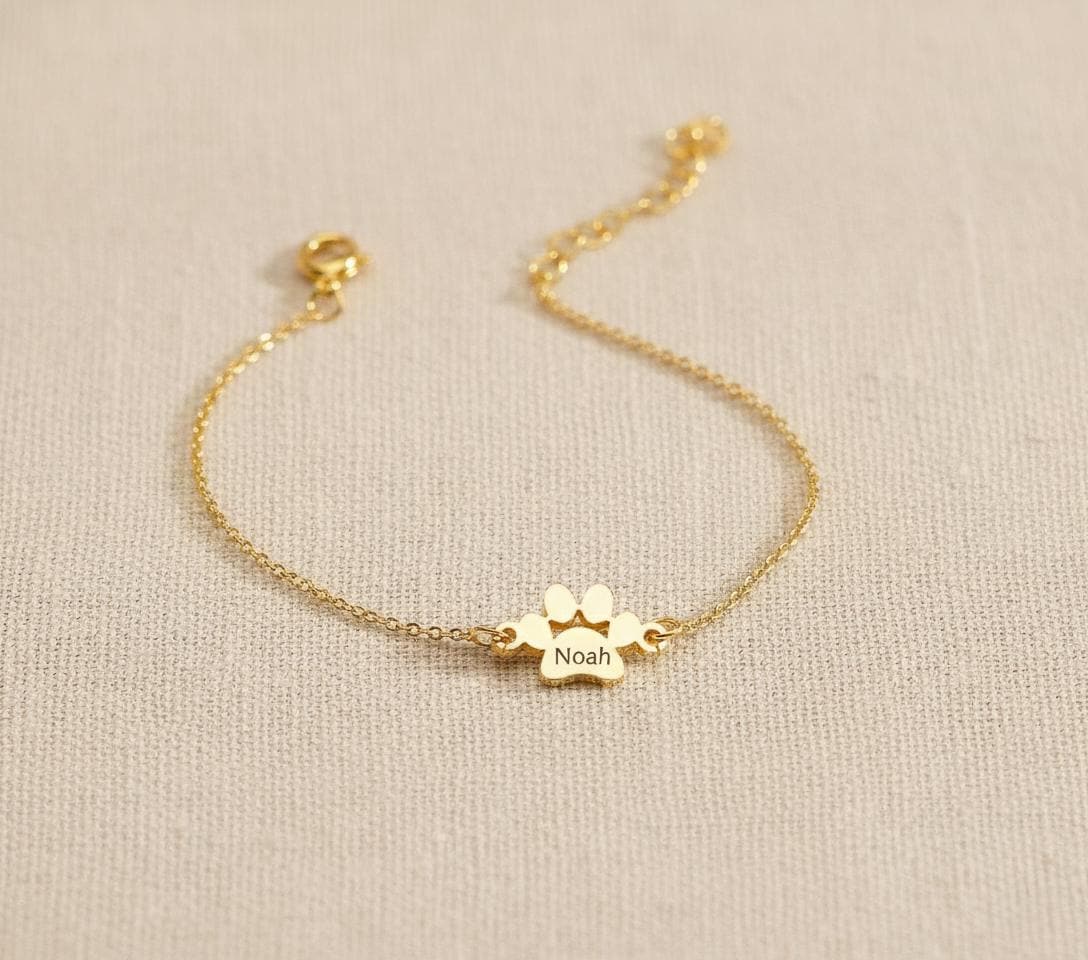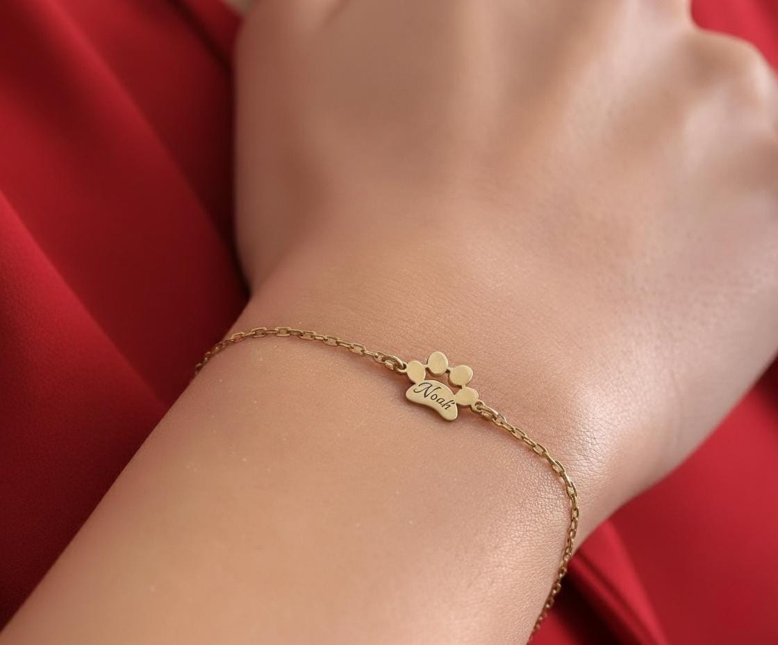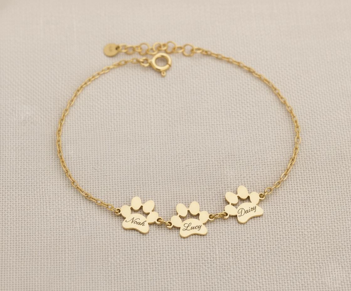 Celebrate the unconditional love of your furry friends with our high-quality sterling silver paw print bracelet, handcrafted to keep your pet’s name close to your heart. Each custom pet bracelet features up to five engraved paw charms, allowing you to personalize it with your pet’s name — a meaningful reminder of your loyal companion.