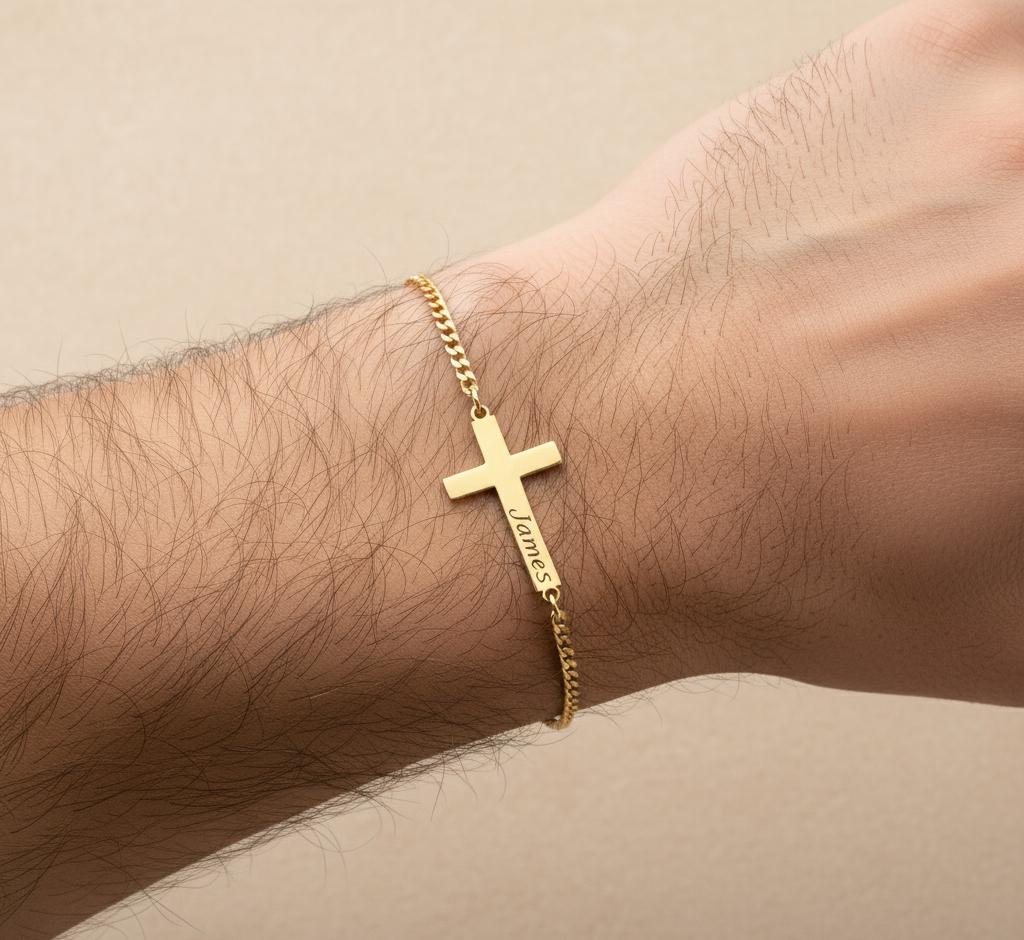 This personalized engraved cross bracelet blends masculine minimalism with meaningful design — a perfect symbol of spirituality, courage, and devotion.