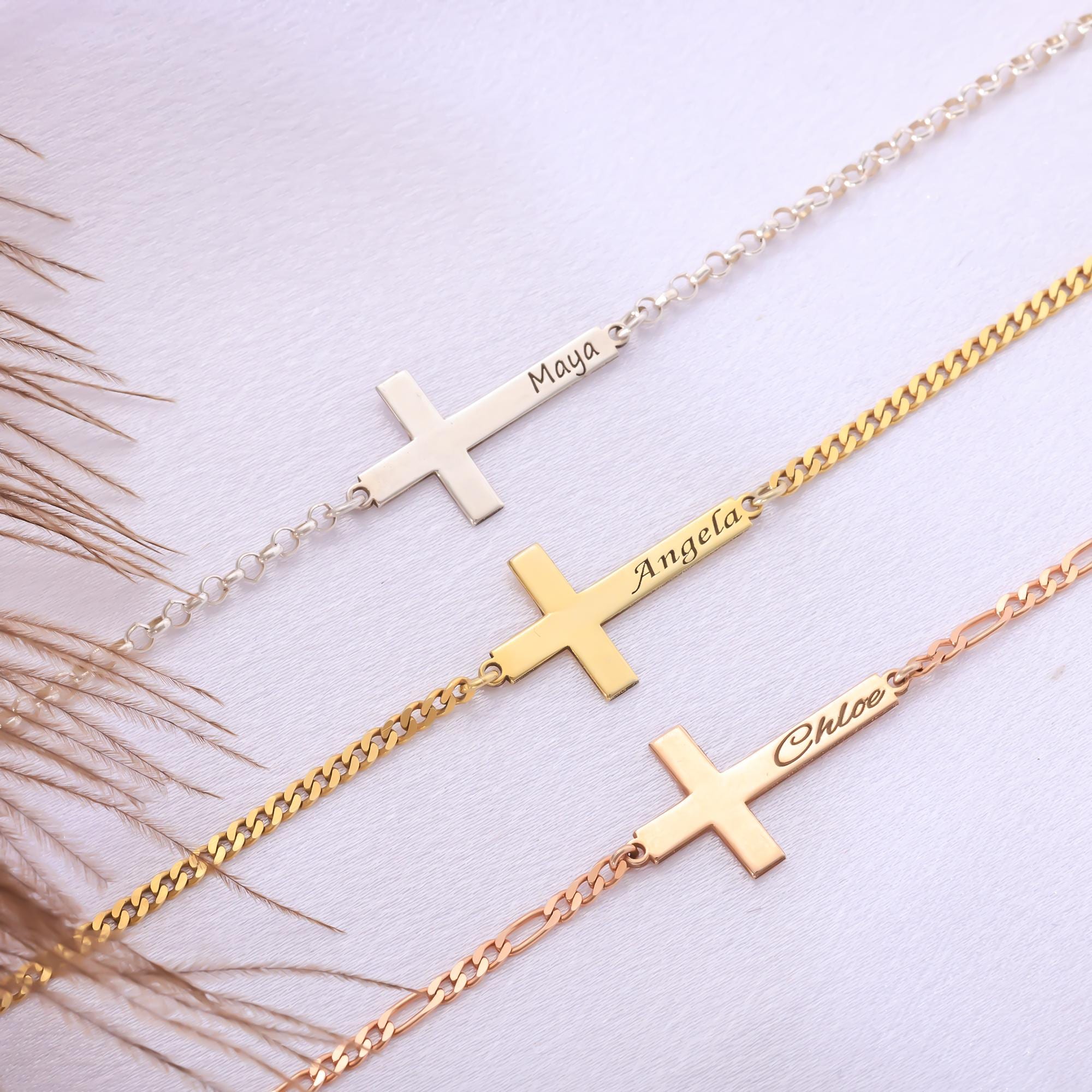 Celebrate faith and devotion with our Personalized Cross Bracelet, a beautiful symbol of belief handcrafted from 925 sterling silver and plated in your choice of gold, silver, or rose gold.
