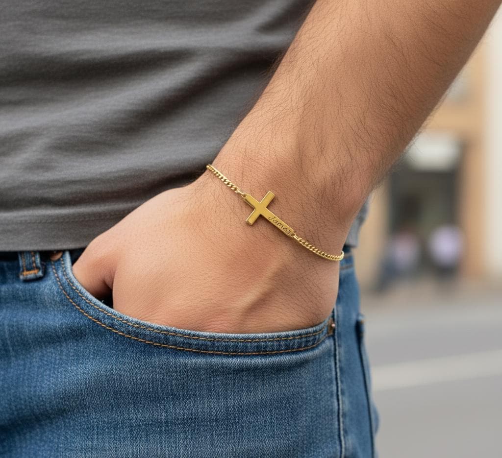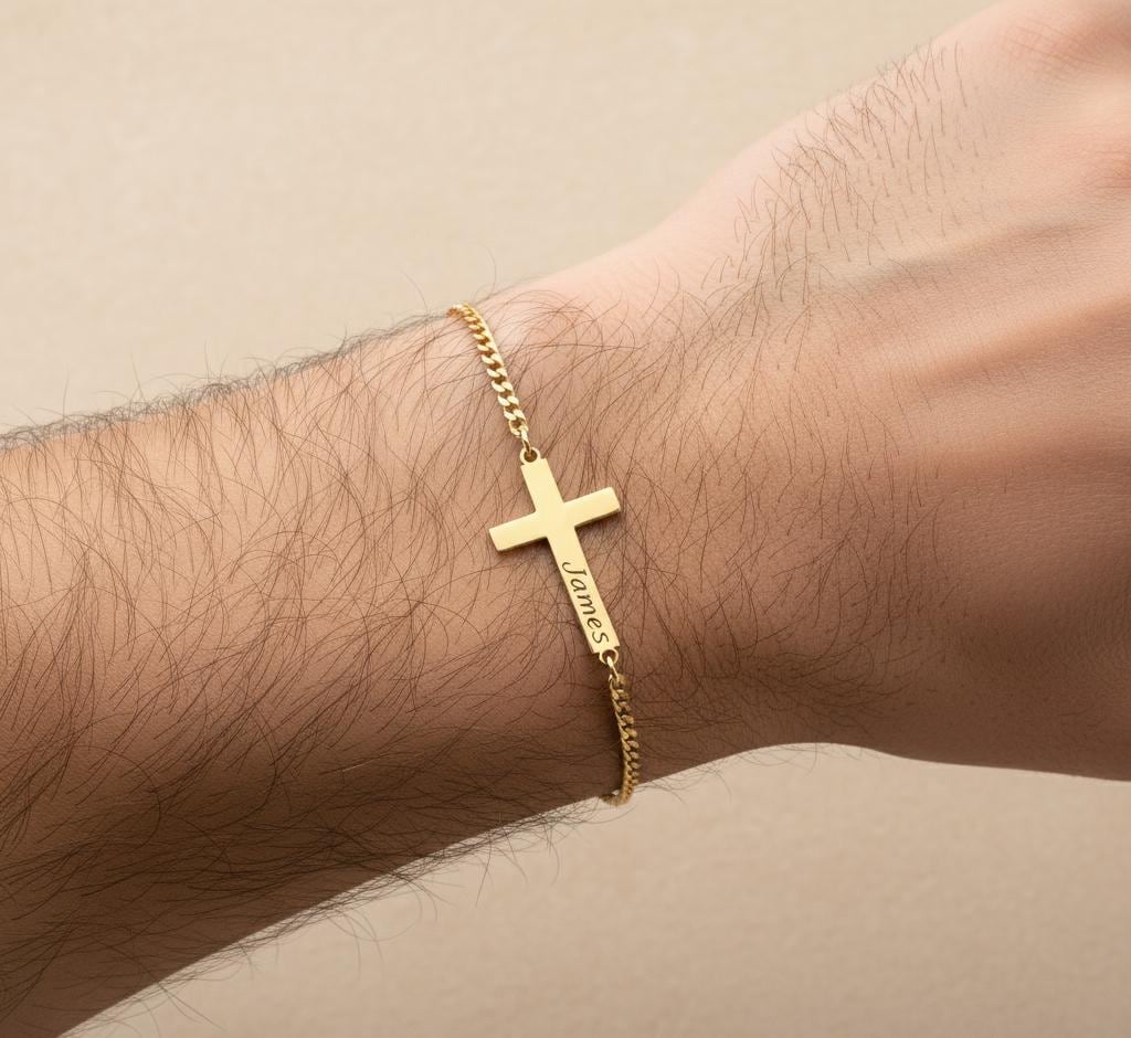 This Christian bracelet is designed with a minimalist cross charm that rests gracefully on the wrist — representing hope, protection, and divine love.