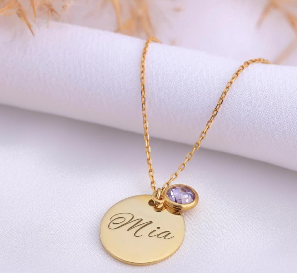 Each delicate round pendant can be engraved with your chosen name or initial, and paired with a sparkling birthstone charm — representing love, family, or cherished memories.