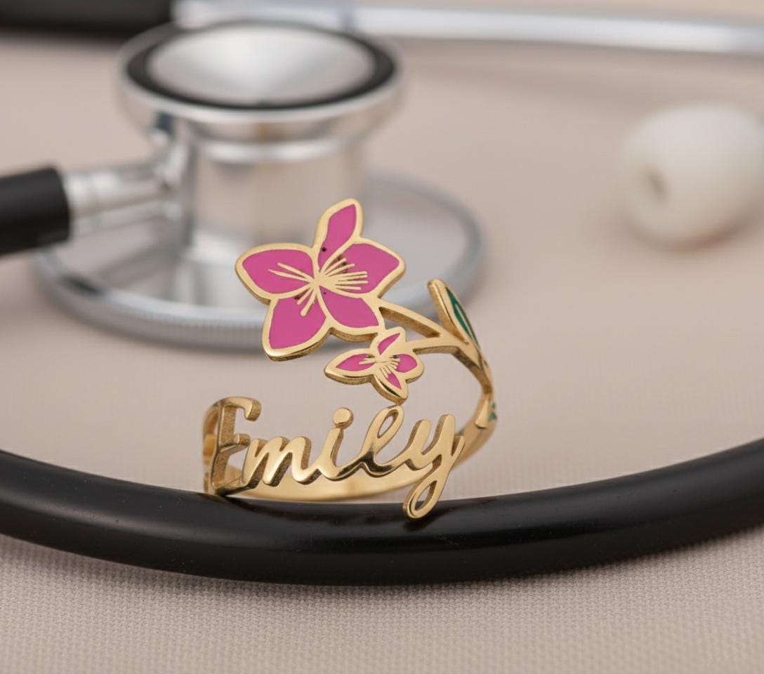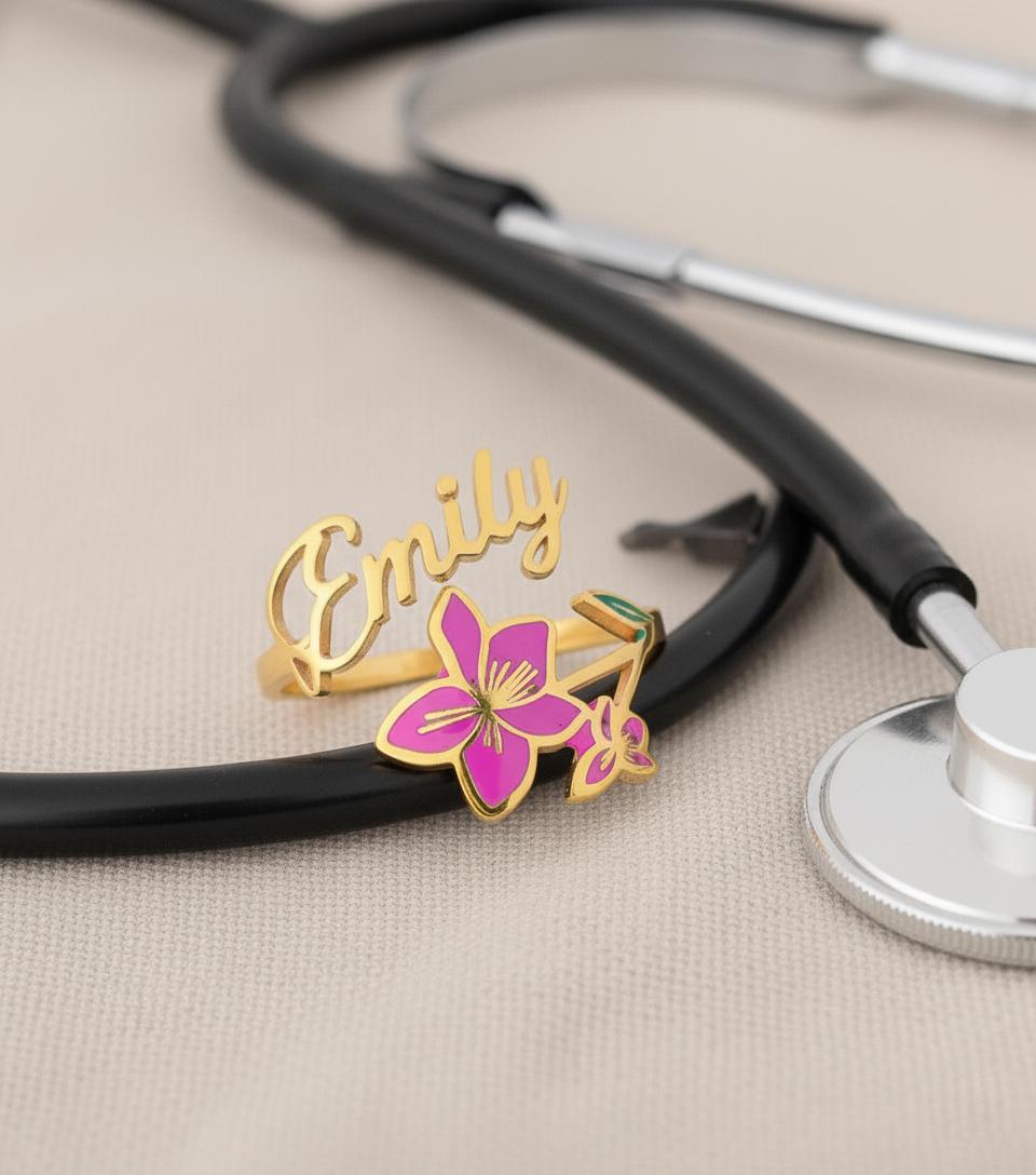 The adjustable ring features a delicate stethoscope design paired with your month’s birth flower in its true enamel color — a meaningful keepsake made especially for nurses, doctors, and medical professionals.