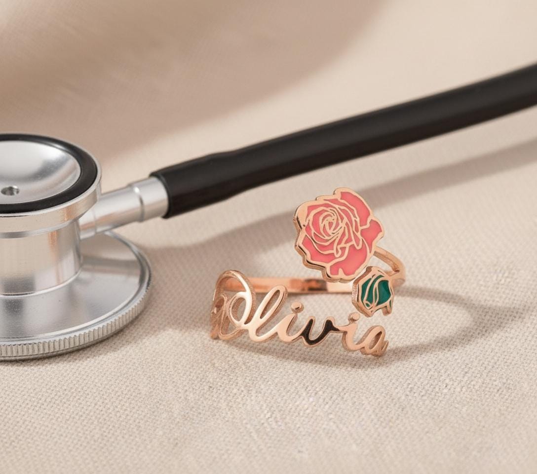 This adjustable ring features a delicate stethoscope design paired with your month’s birth flower in its true enamel colour — a meaningful keepsake made especially for nurses, doctors, and medical professionals.
