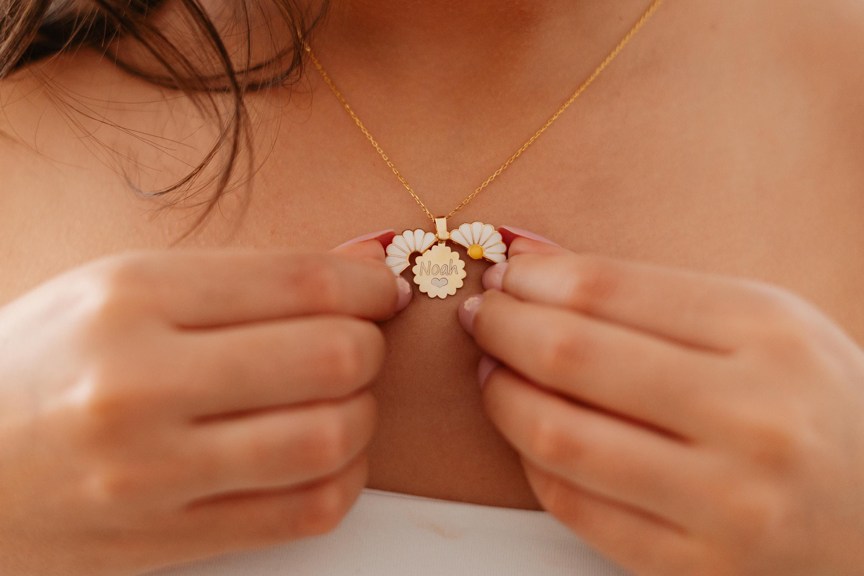✨ Keep your words close to the heart with our Personalised Daisy Hidden Message Necklace, a charming keepsake that hides your chosen name or secret message inside delicate daisy petals.