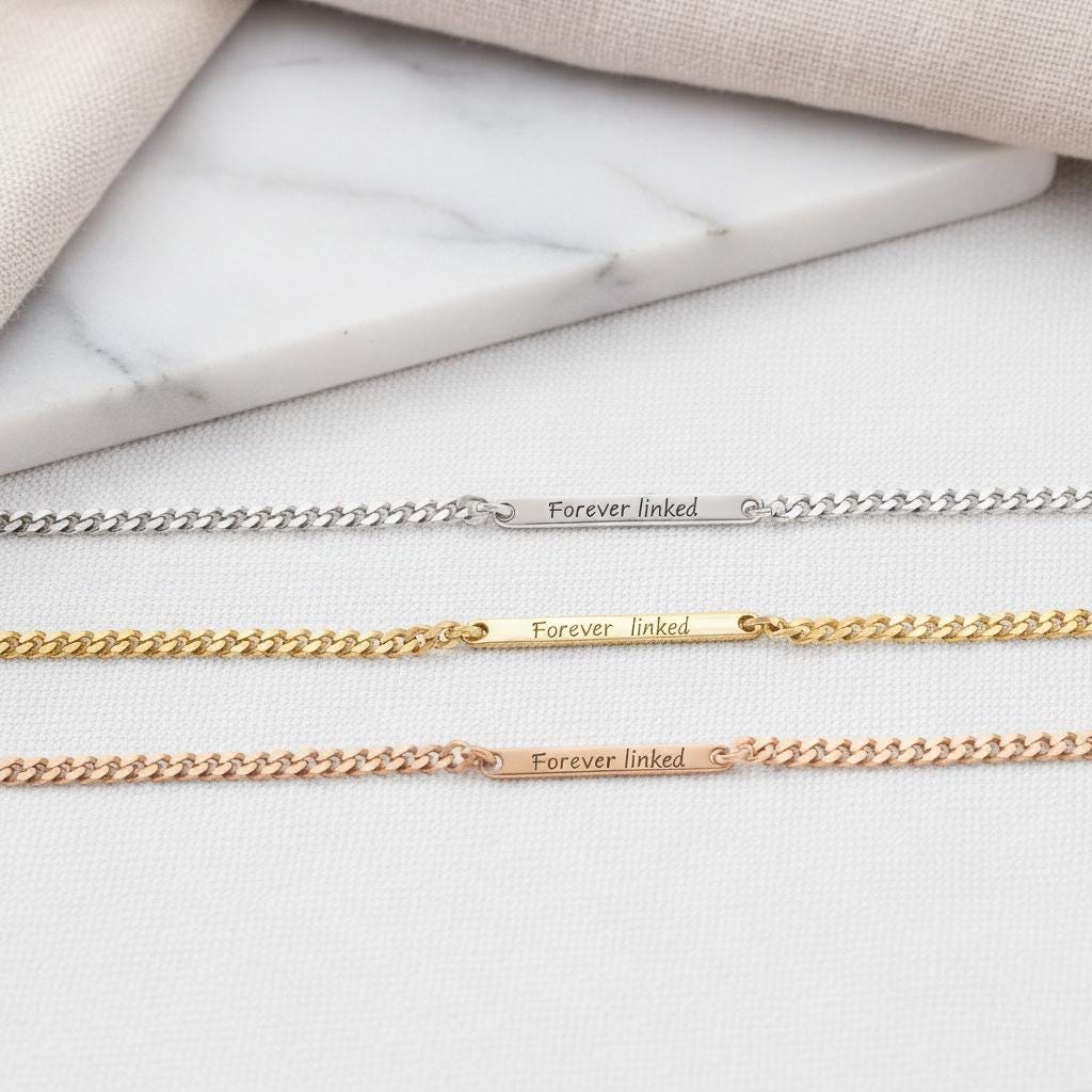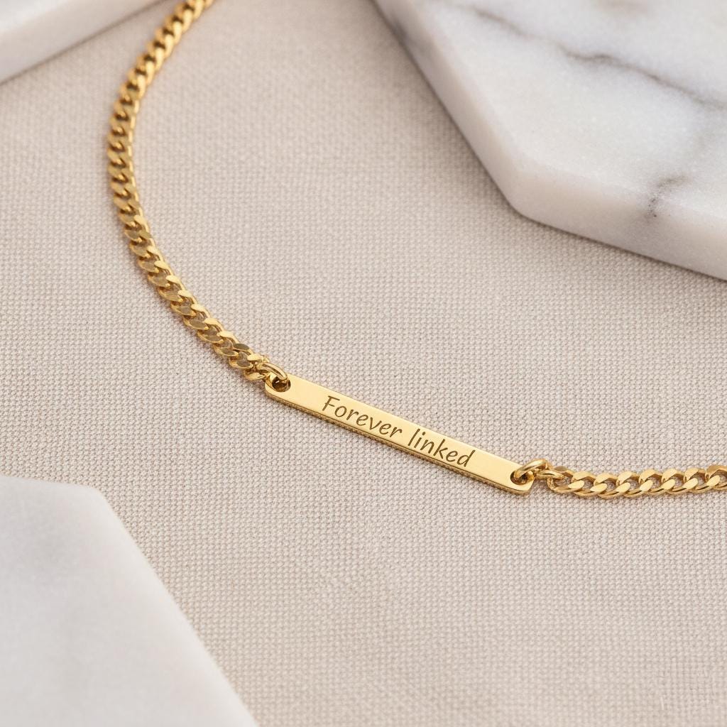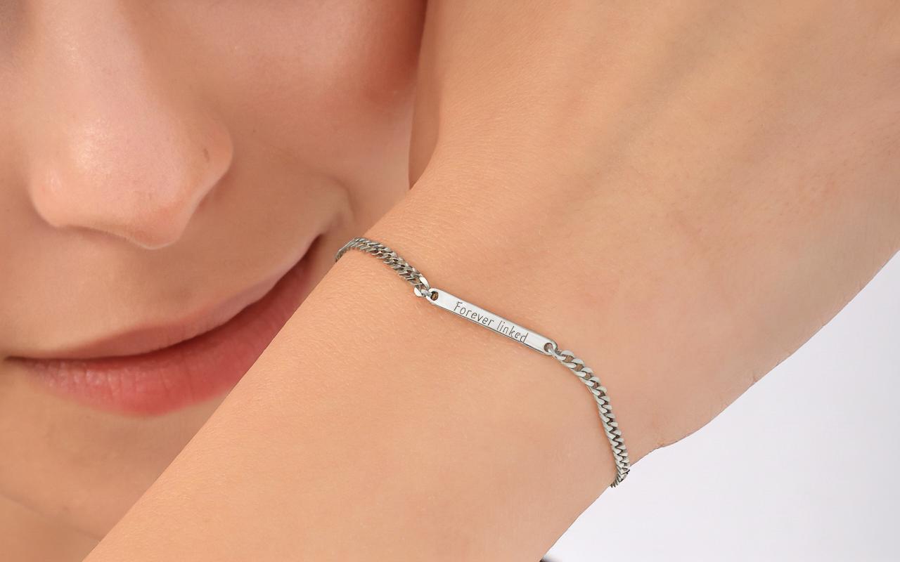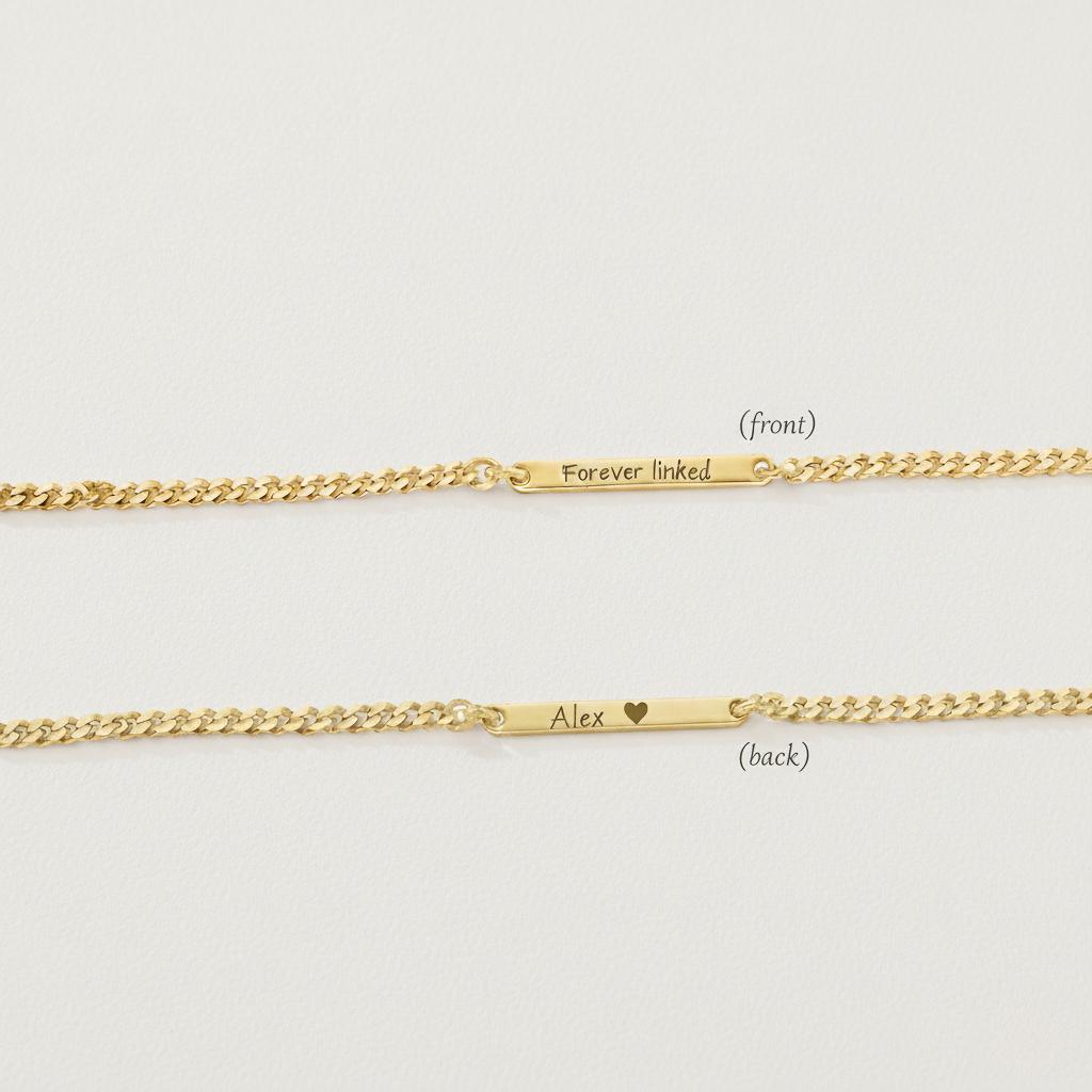 The front is engraved with the fixed message “Forever Linked”, while the back can be personalised with your own engraving — a name, date, or hidden message (up to 16 characters).