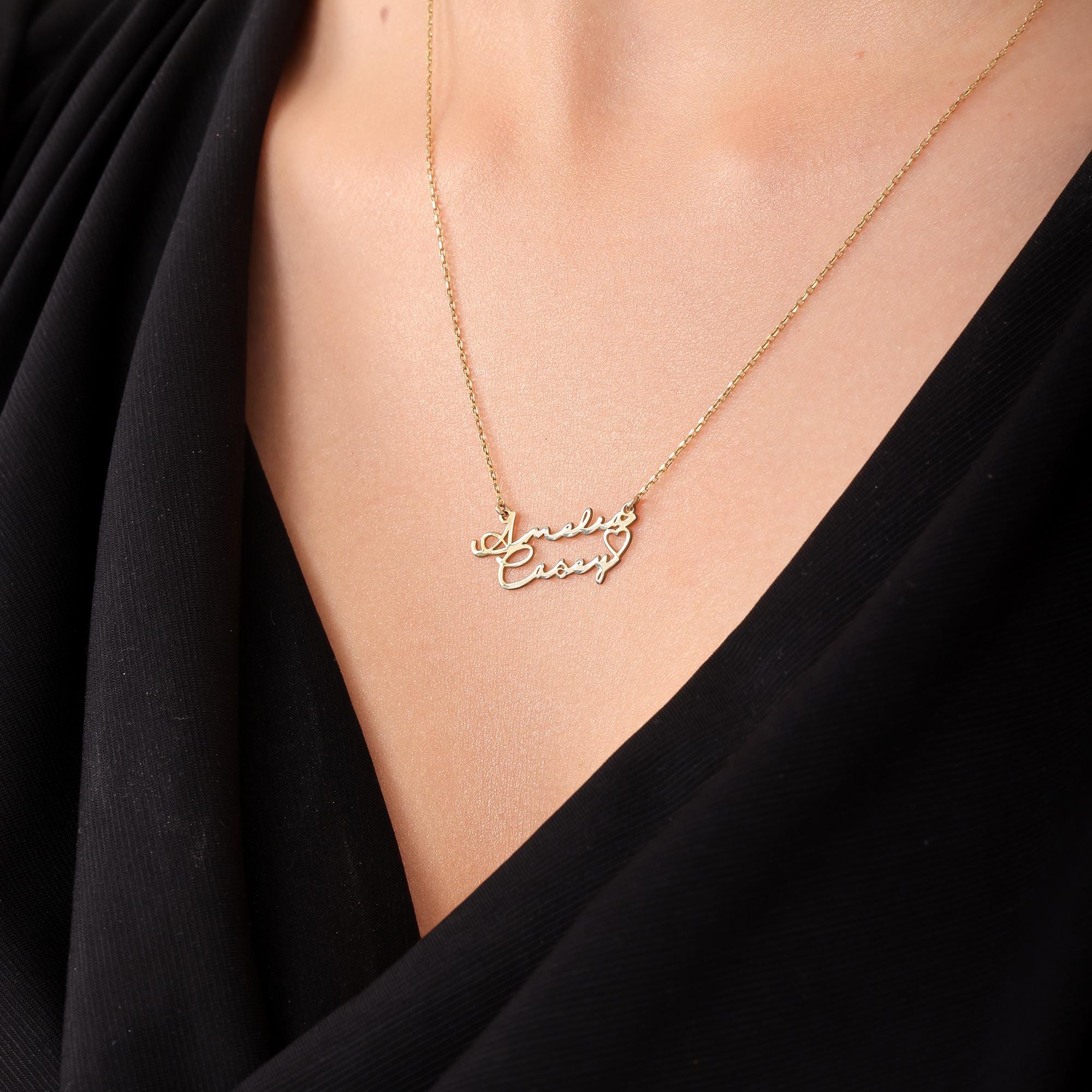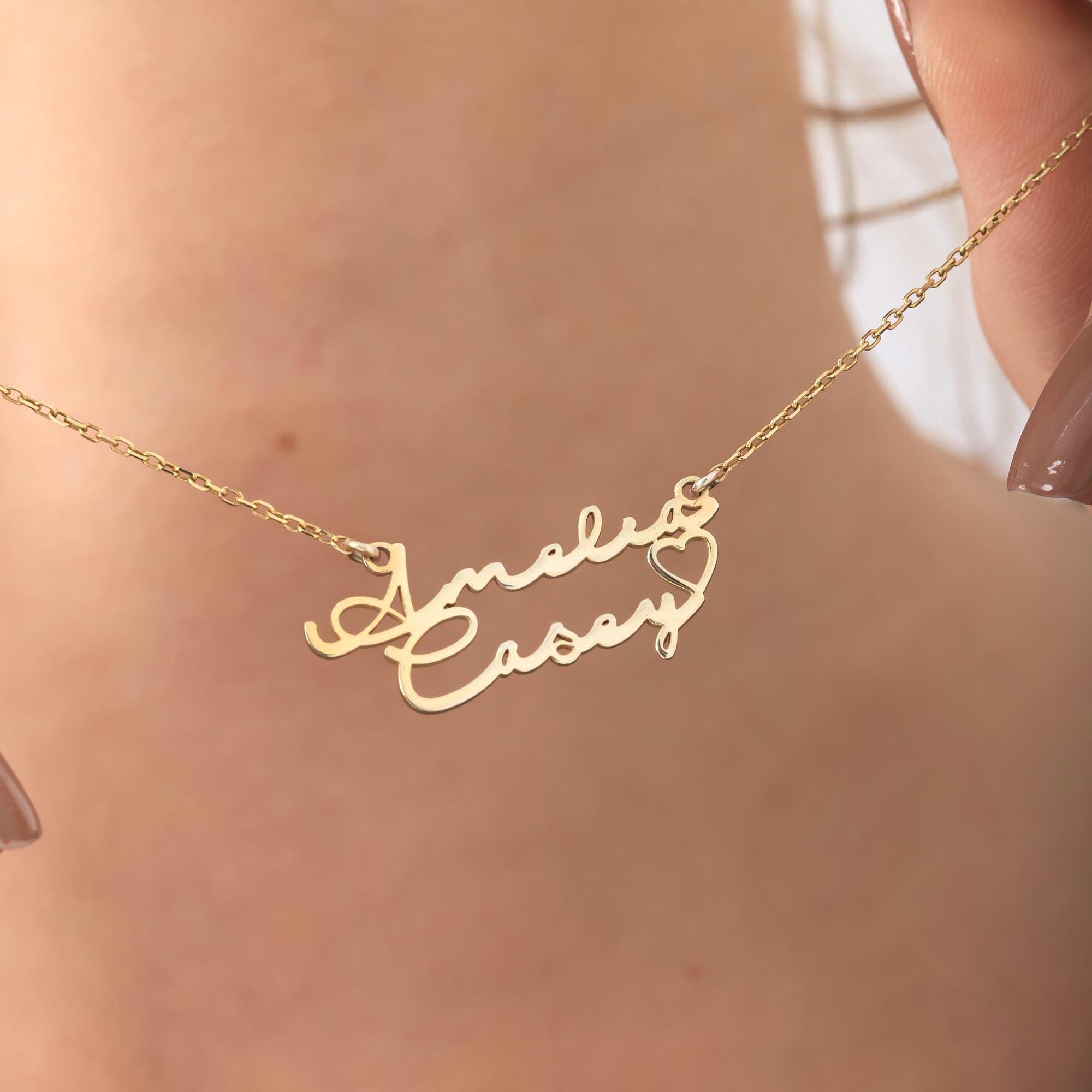 This Double Name Necklace with Heart features two beautifully linked names in a delicate cursive design — a perfect keepsake for couples, siblings, or children’s names.