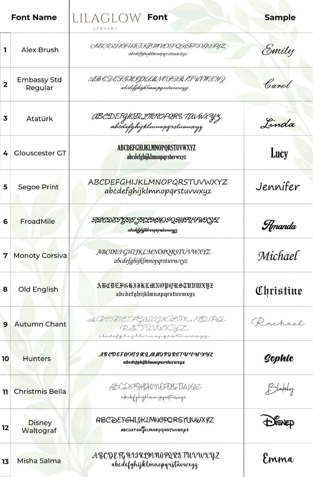 Font Options: 13 engraving fonts (see the font chart in listing photos)