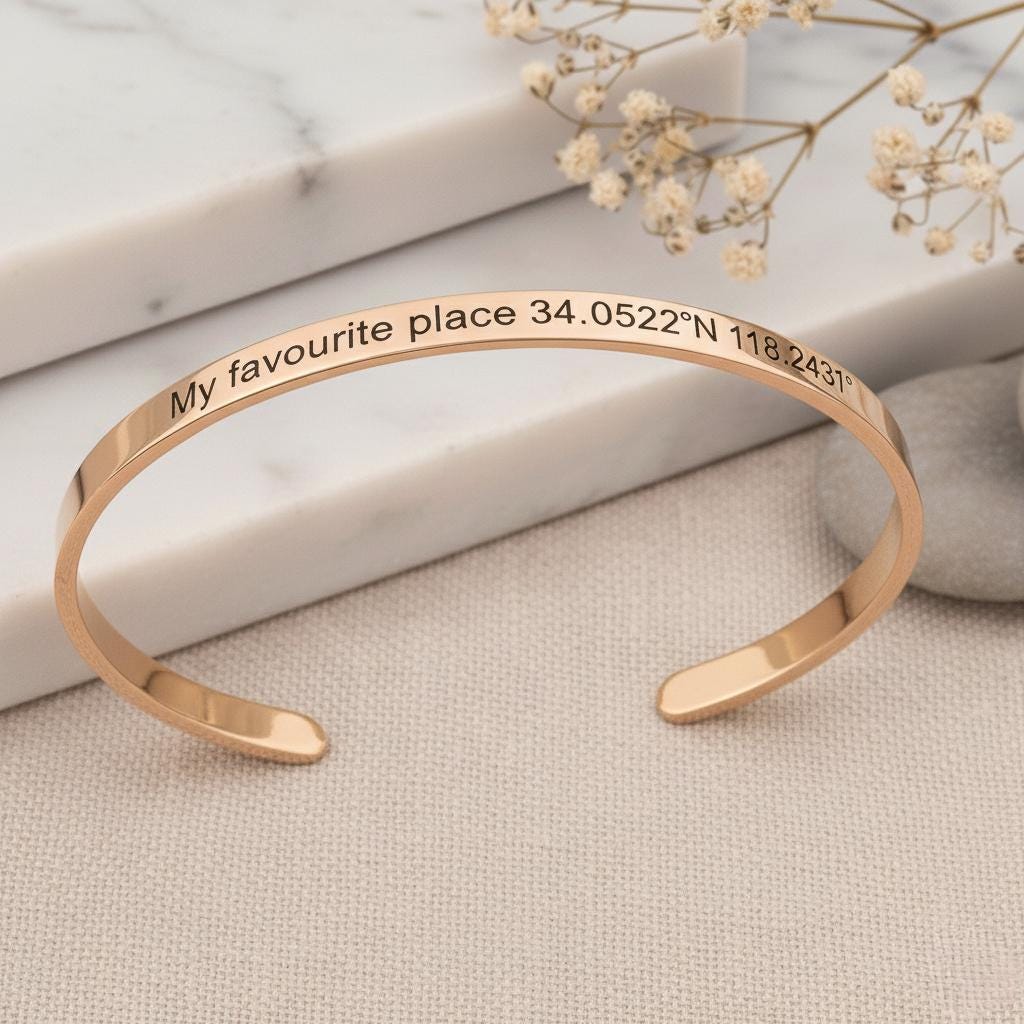 Perfect as a gift for her, anniversary bracelet, coordinates bracelet, custom name cuff, or a sentimental everyday keepsake.